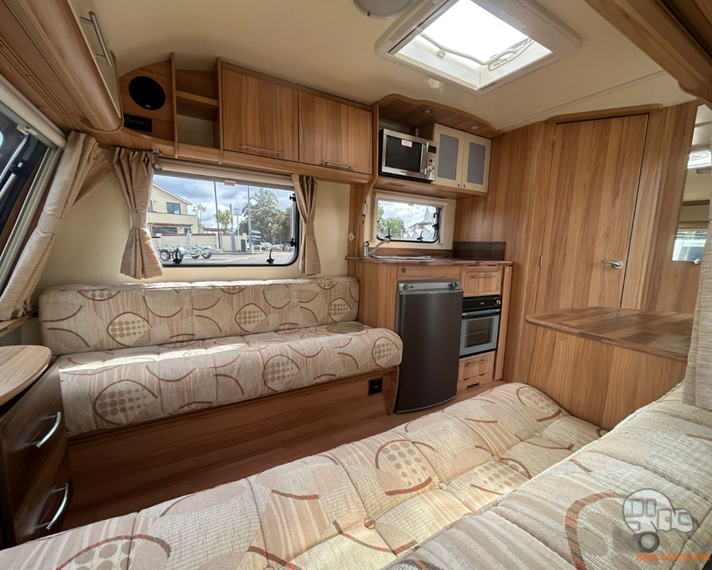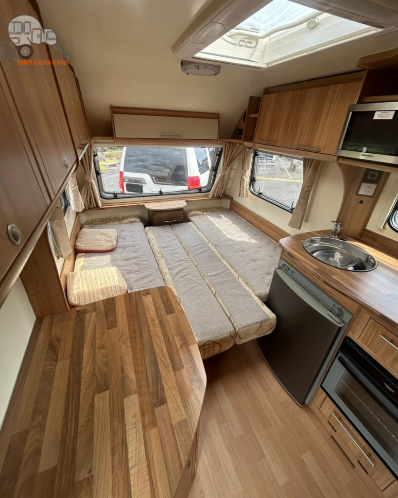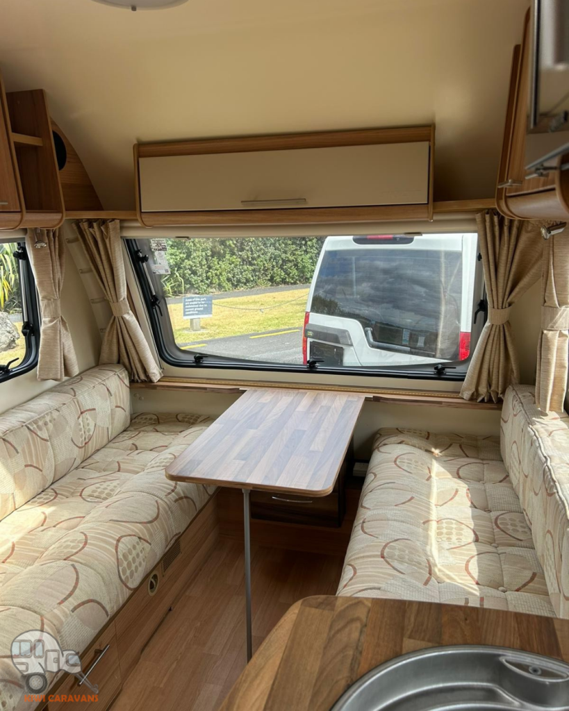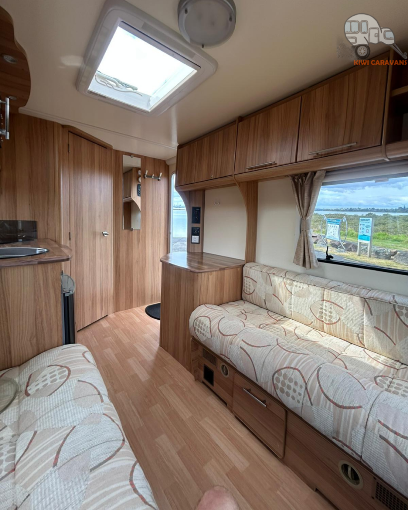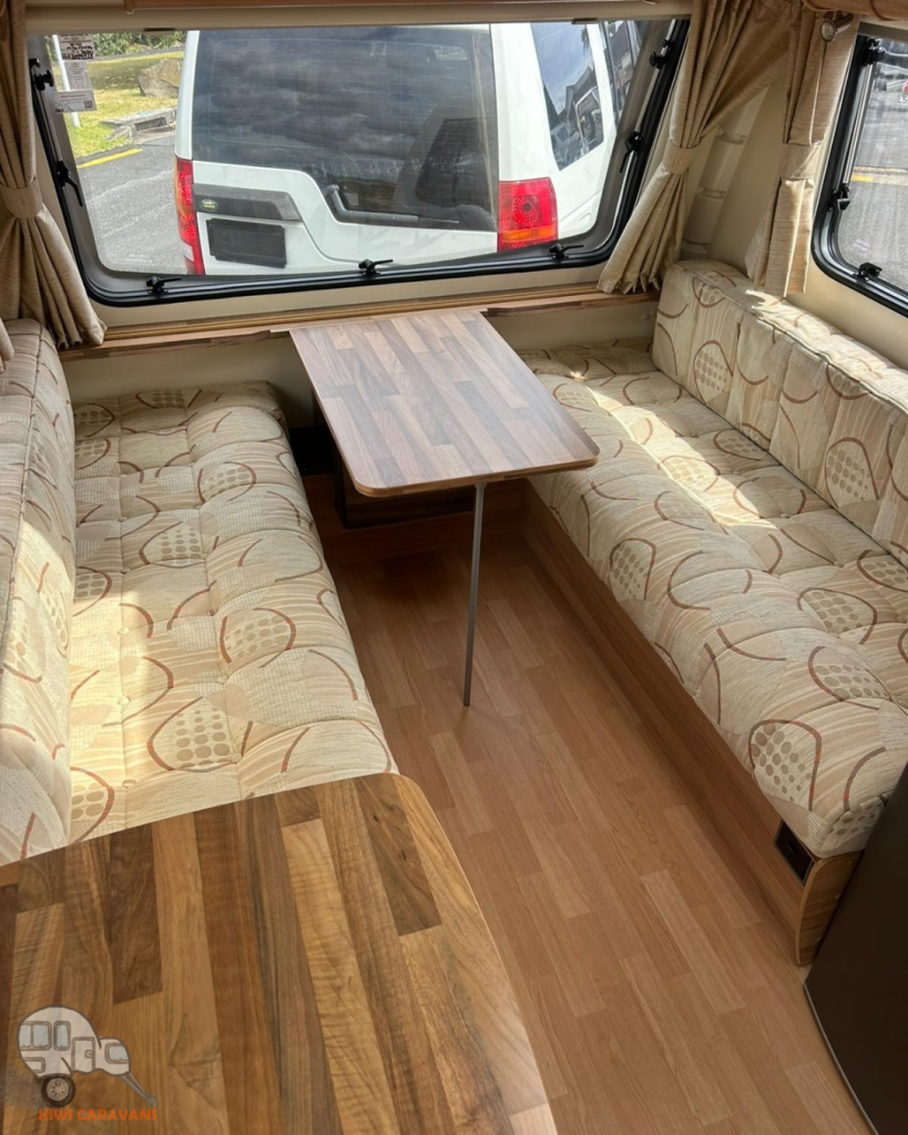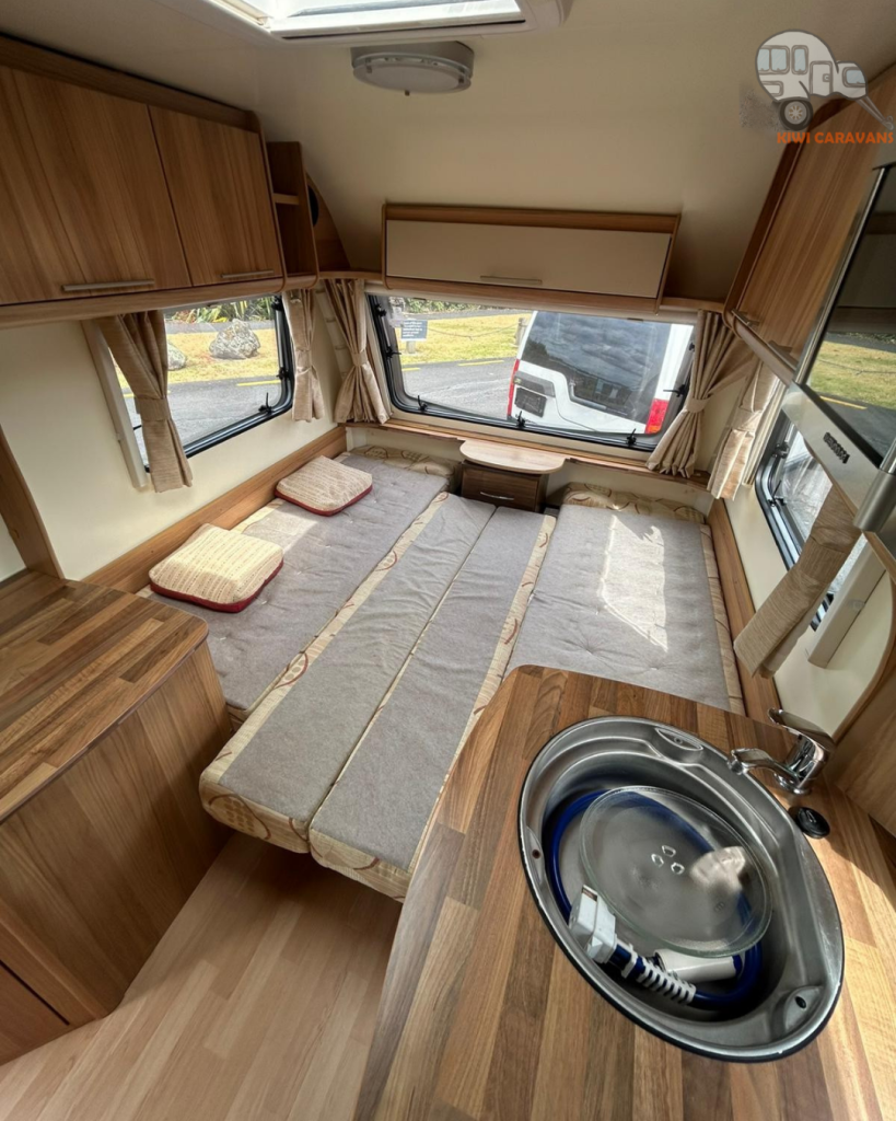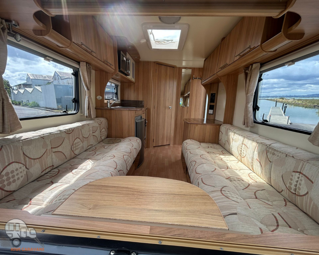 Up front you have the seated area which has an occasional and freestanding table that is stored in it’s own cupboard for convenience. The area can be easily made into two singles or a full sized double bed.