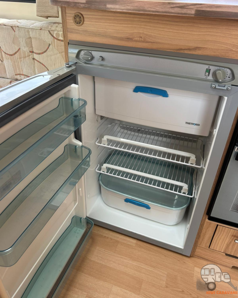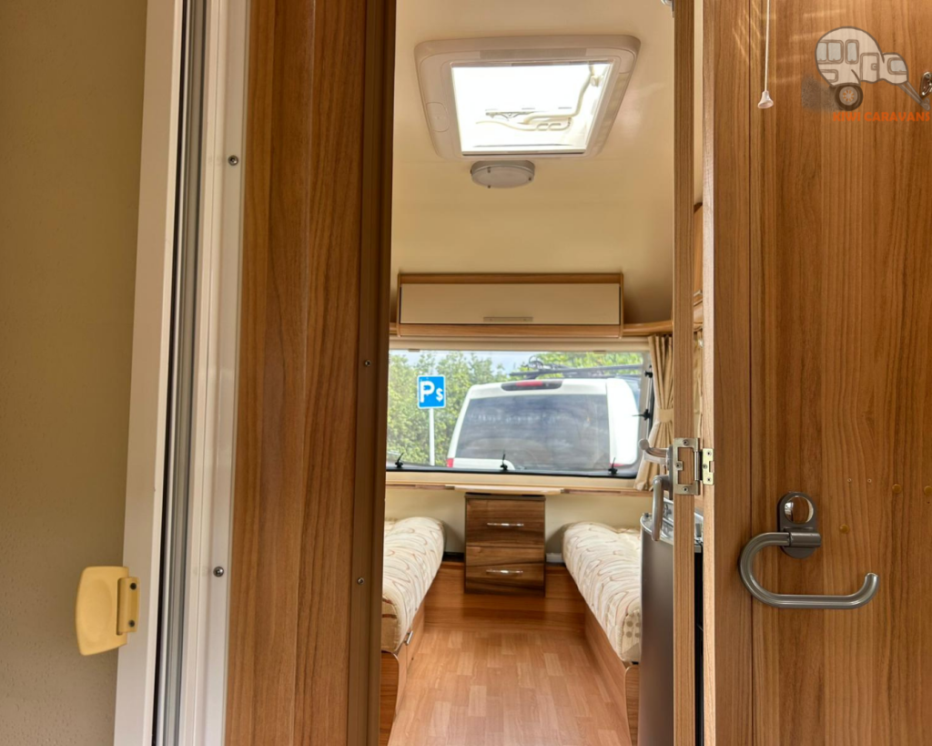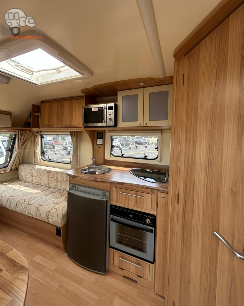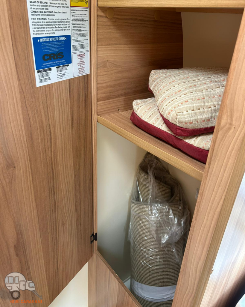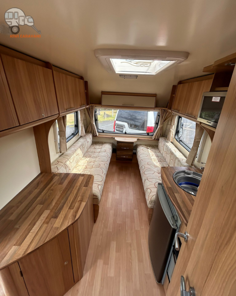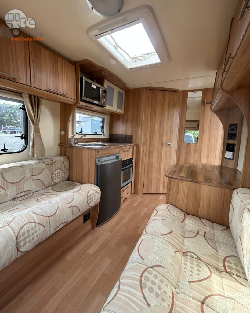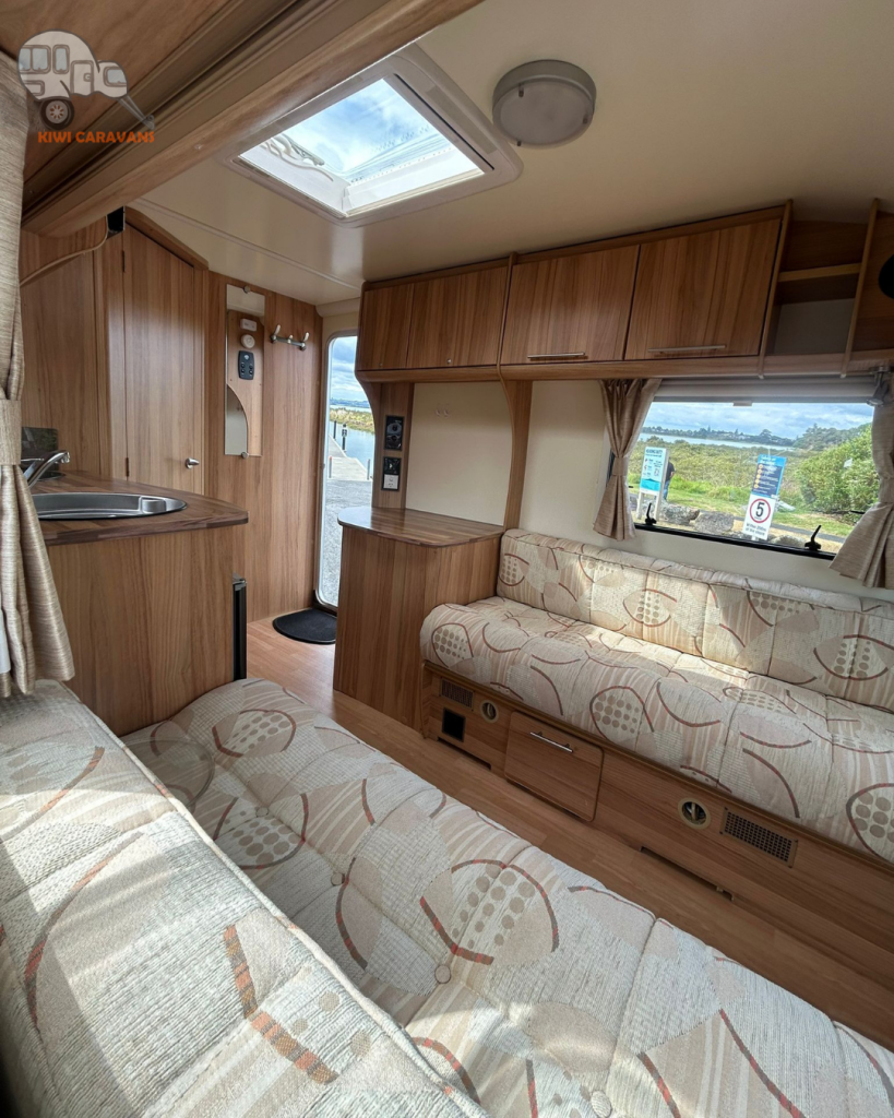 Up front you have the seated area which has an occasional and freestanding table that is stored in it’s own cupboard for convenience. The area can be easily made into two singles or a full sized double bed.
