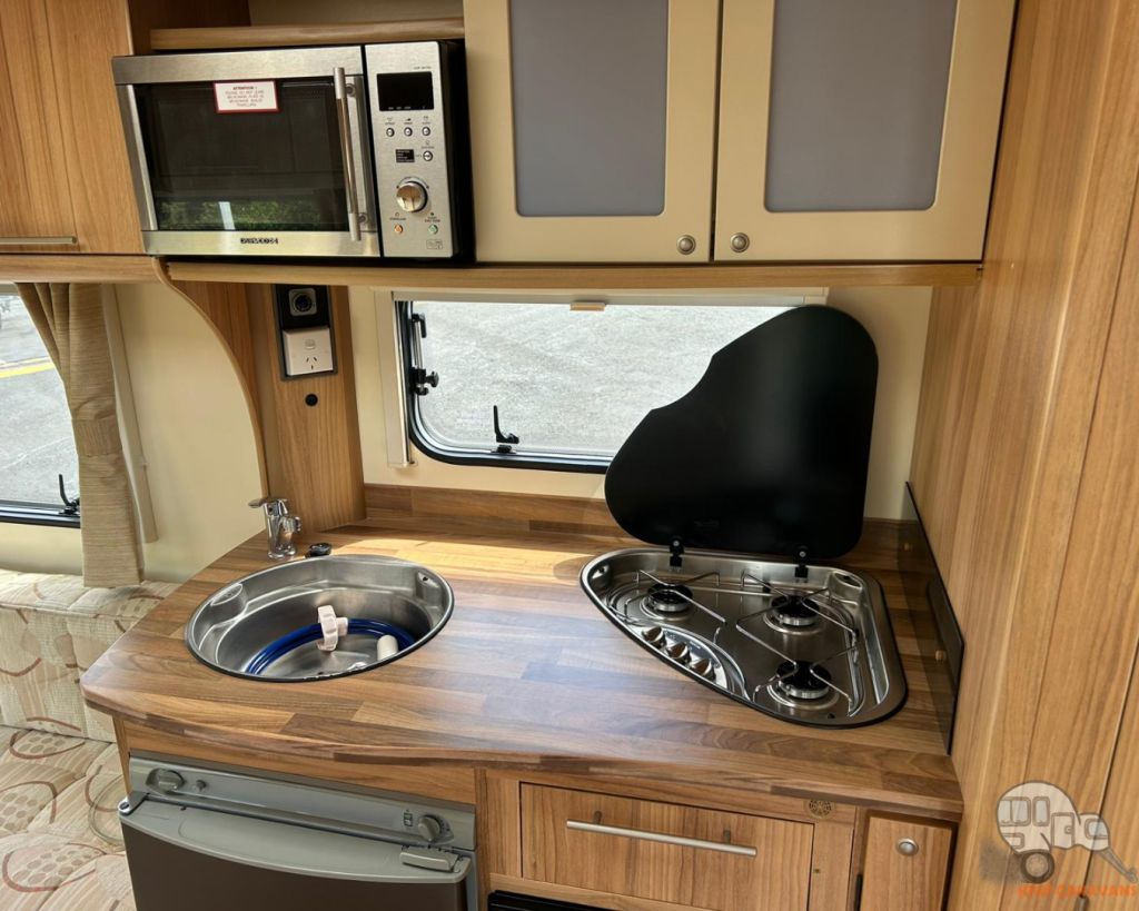 In the middle of the caravan is the kitchen which has a 3 way fridge, oven, grill, 3 Burner gas Hob , wash basin, and plenty of storage.
