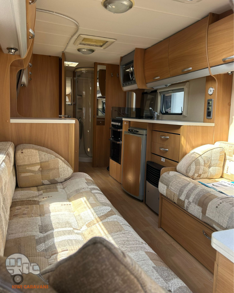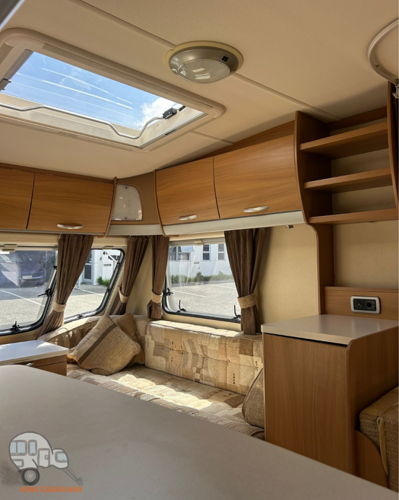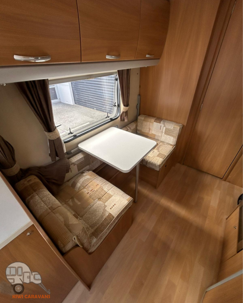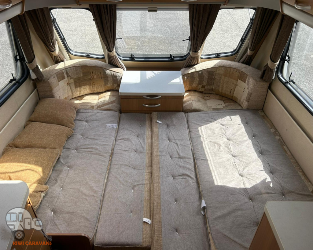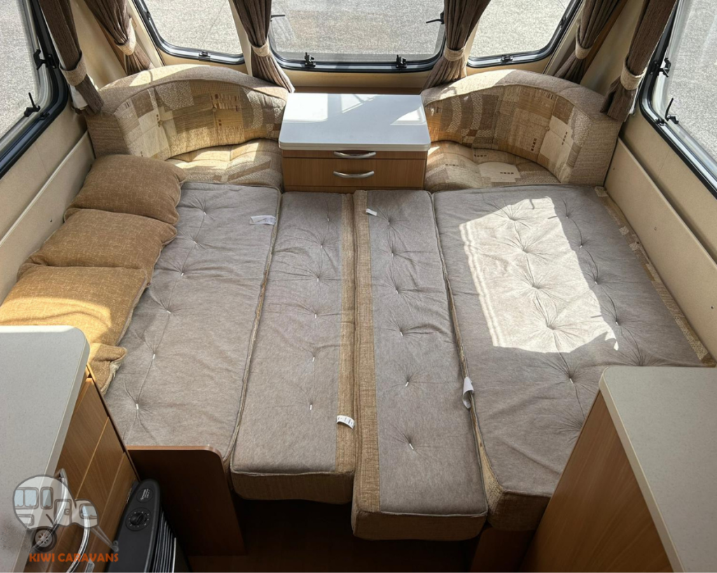 Up front you have the seated area which has an occasional and freestanding table that is stored in it’s own cupboard for convenience. The area can be easily made into two singles or a full sized double bed.