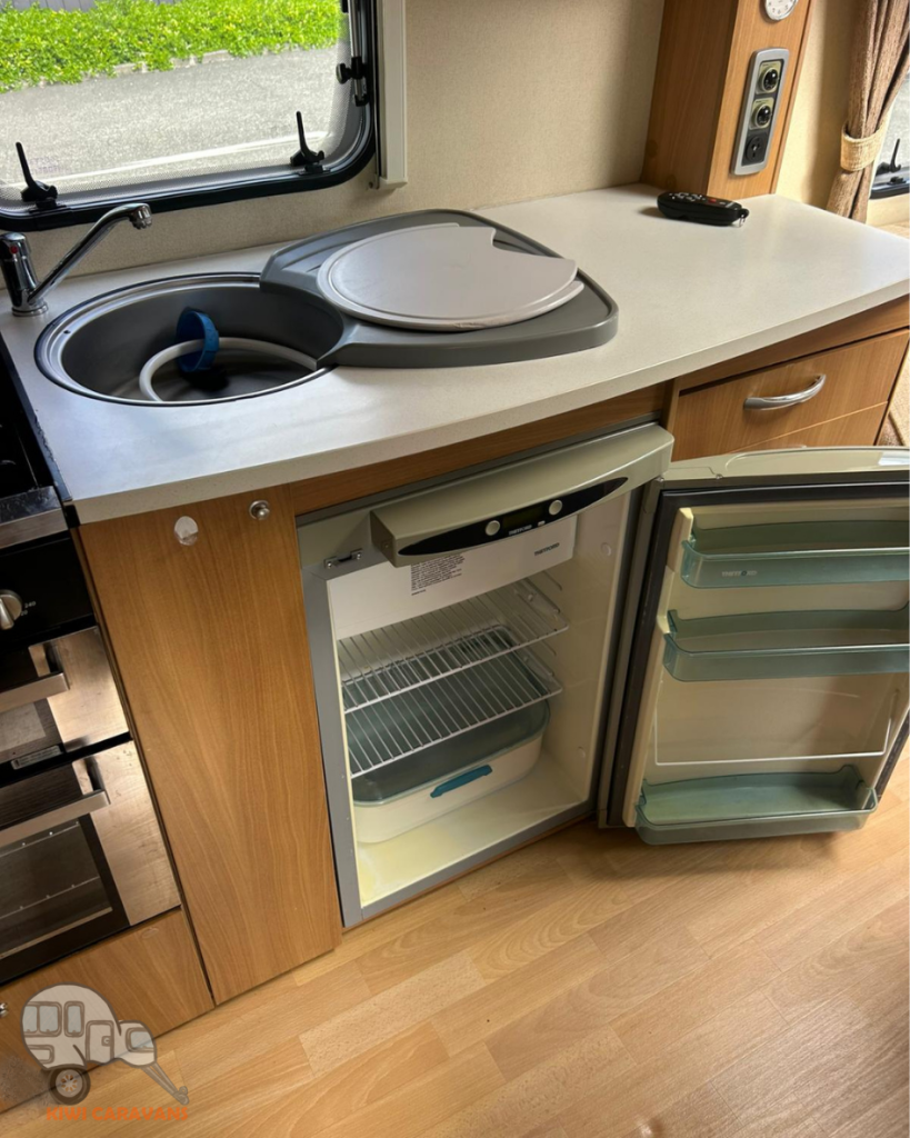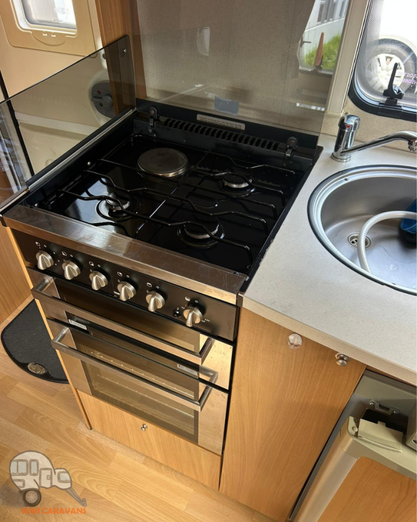 In the middle of the caravan is the kitchen which has a 3 way fridge, oven, grill, 4 burner hob (3 gas, 1 electric), wash basin, and plenty of storage. Opposite the kitchen is also the 2 way heater and the second seated area which can easily convert into bunk beds.